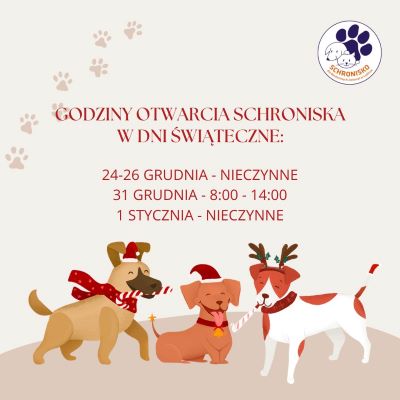GODZINY OTWARCIA SCHRONISKA W OKRESIE ŚWIĄTECZNYM!Przez admin / 2025-12-22 GODZINY OTWARCIA SCHRONISKA W OKRESIE ŚWIĄTECZNYM:24-26 GRUDNIA – NIECZYNNE31 GRUDNIA – 8:00 – 14:001 STYCZNIA – NIECZYNNE