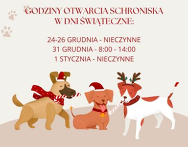 GODZINY OTWARCIA SCHRONISKA W OKRESIE ŚWIĄTECZNYM: 24-26 GRUDNIA – NIECZYNNE 31 GRUDNIA – 8:00 – 14:00 1 STYCZNIA – NIECZYNNE