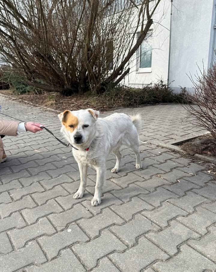 Biały z rudymi znaczeniami Piorun trafił do schroniska z ul. Pogodnej.